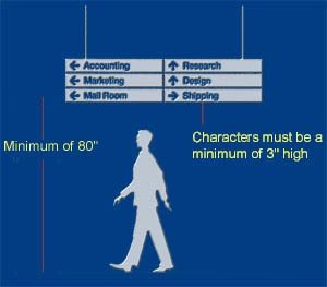 Signs which are projected or suspended overhead must meet requirements for clearance, character proportion and height, sign finish and contrast.