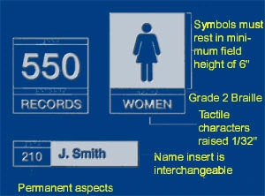 Characters must be raised exactly 1/32". Grade 2 Braille must accompany characters. Typestyles Characters must be in upper case and sans serif or a simple serif style.